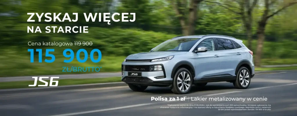JS6 to nowoczesny miejski SUV, który łączy dynamiczny design z zaawansowanymi technologiami i bogatym wyposażeniem, zapewniając wysoki komfort codziennej jazdy.