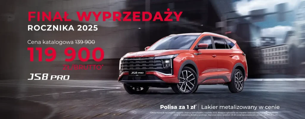 JAC JS8 PRO objęty jest 5-letnią gwarancją lub limitem 150 000 km na cały pojazd, co potwierdza wysoką jakość wykonania i niezawodność. Dodatkowo producent oferuje 3-letnią ochronę powłoki lakierniczej oraz 10-letnią gwarancję na perforację nadwozia.