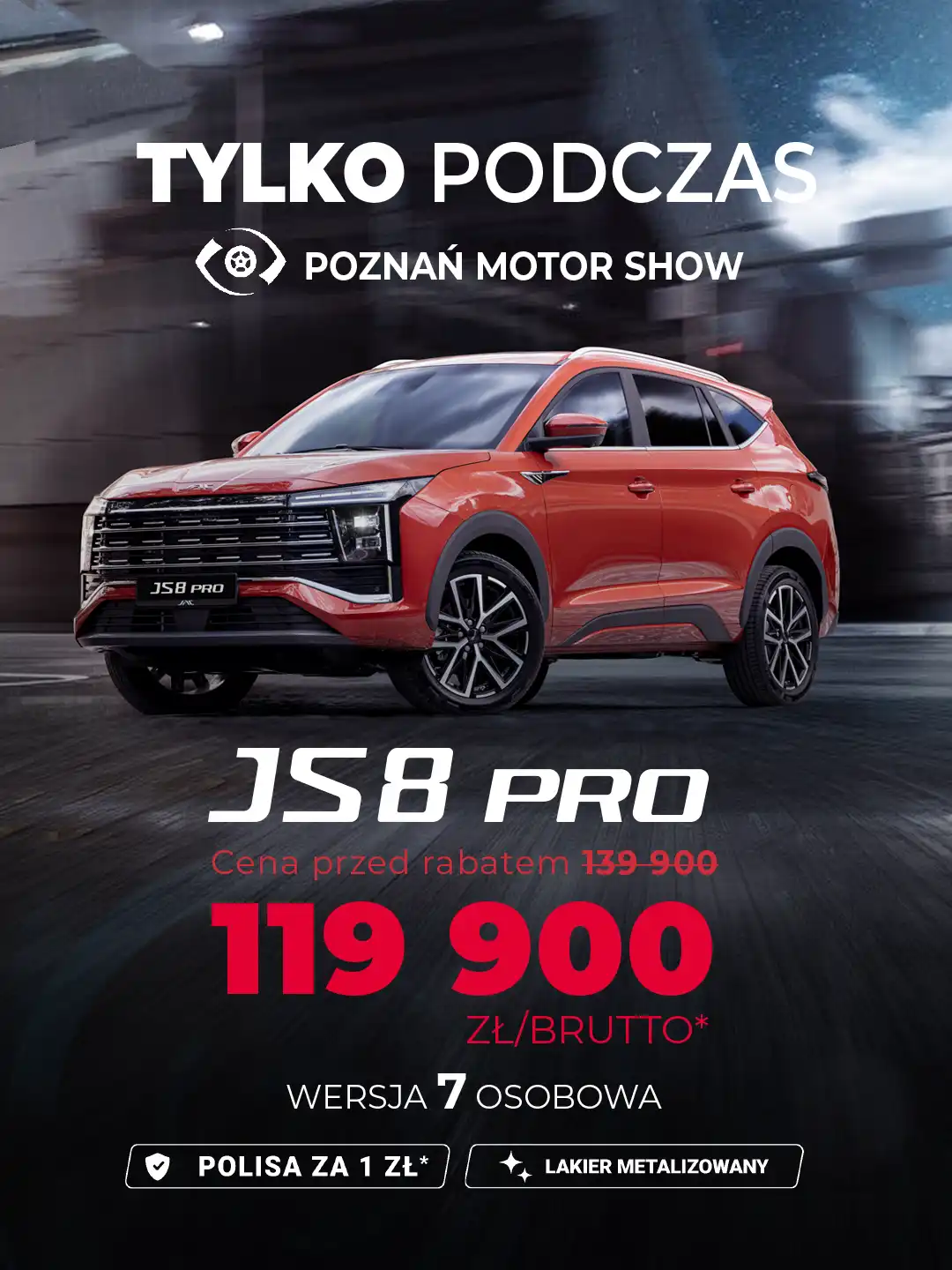 *Ogłoszenie ważne w dniach 23–26.04.2026 r., dotyczy wybranych modeli z rocznika 2025. Liczba pojazdów objętych promocją jest ograniczona do 100 sztuk lub do wyczerpania zapasów. Ogłoszenie nie stanowi oferty w rozumieniu Kodeksu cywilnego. Najniższa cena z ostatnich 30 dni 129 900 zł brutto.
